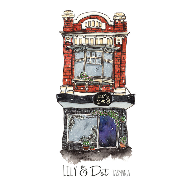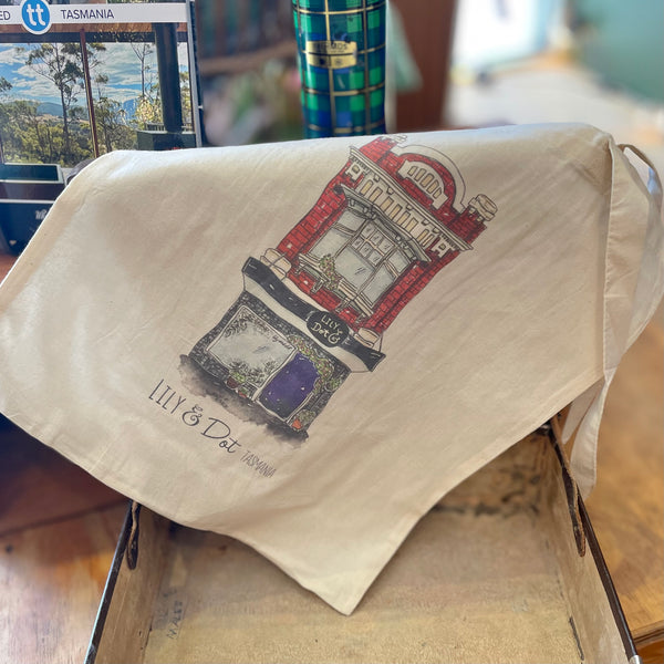 Stunning 100% recycled cotton tote bags featuring the commissioned artwork of Hobart artist Pablo Pandani's interpretation of the Lily & Dot shopfront. Now your favourite shop can go out and about with you anywhere!